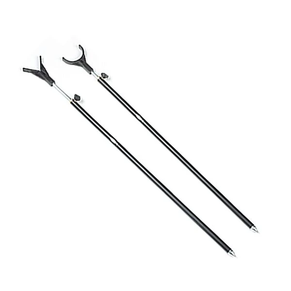 Steunenset voor het afleggen van de karperhengel. de voorste steun heeft een uitsparing voor een vrije lijngeleiding.