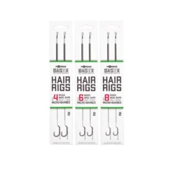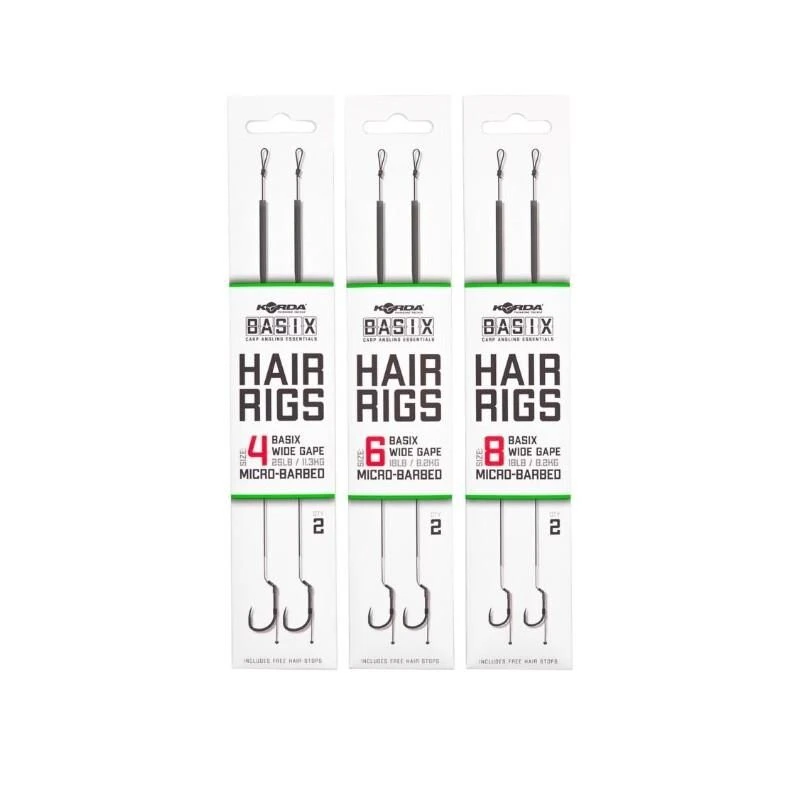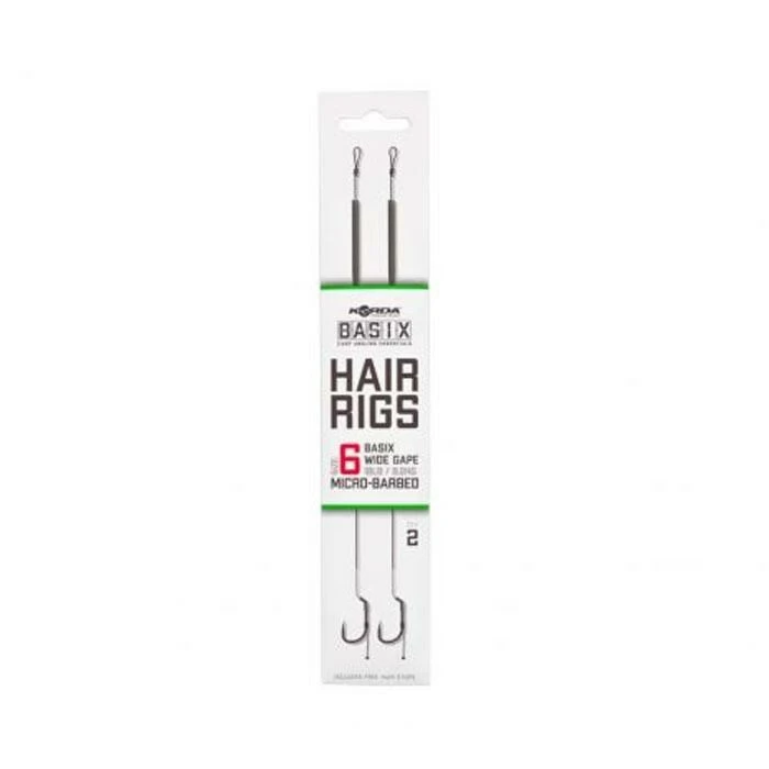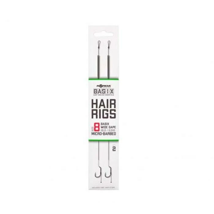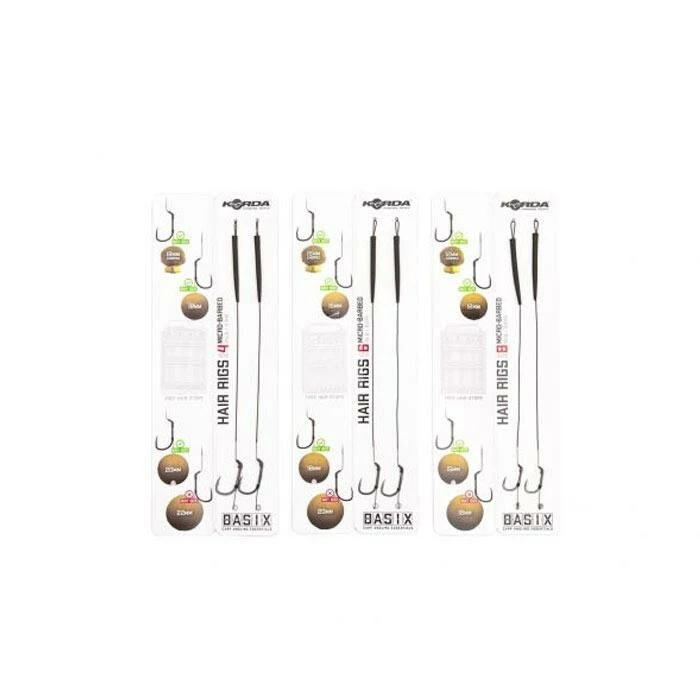De korda BASIX Ready Tied Hair Rigs zijn klaar om gelijk uit de verpakking gebruikt te worden. Je hoeft enkel nog een bodemaas of wafter toe te voegen en je bent klaar om te vissen. De rigs zijn geknoopt met het camo green gekleurde BASIX Coated Hooklink materiaal. Een klein gestript stukje bij de BASIX Wide Gape haak zorgt voor bewegingsvrijheid en grotere kans op goede inhaking. De onderlijn heeft een soepele hair die is voorzien van een stukje silicone die hem op zijn plek houdt en de kans op in de war werpen verkleint. De lengte van de hair is geoptimaliseerd voor haakaas formaten die passen bij de gekozen haakmaat.