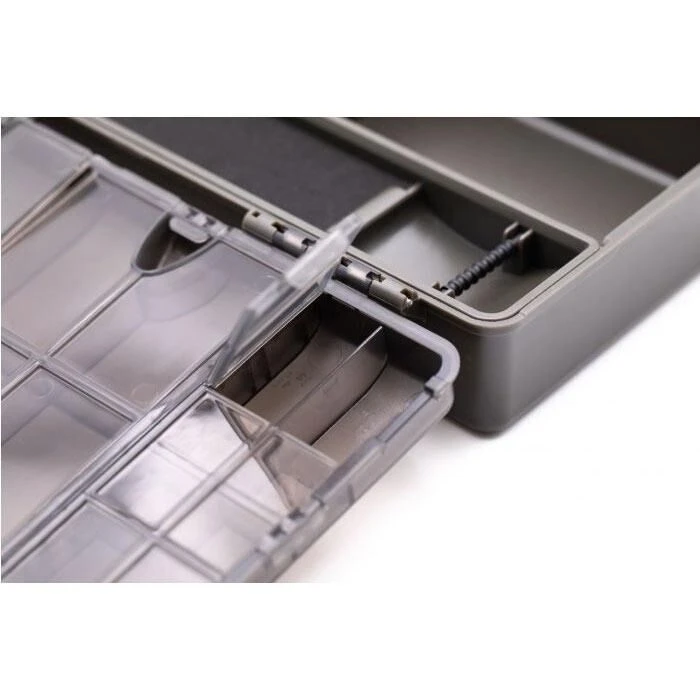 Binnenin het deksel van de Korda BASIX Tackle Box zitten 21 kleine vergrendelbare compartimenten van verschillende grootte, die perfect zijn voor het opbergen van zaken zoals Leadclips en wartels. Binnenin de box zijn er twee grote compartimenten, met vaste verdelers, die perfect zijn voor rig tools, hook link spools en