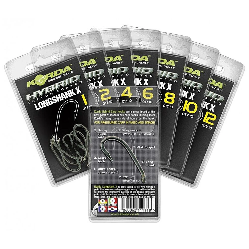 Deze haak was gebaseerd op de populaire, originele fly-hookpatronen, die geliefd waren bij karpervissers vanwege hun vorm en haakvermogen, maar dit is een veel sterkere en scherpere versie van dat patroon. Dit patroon is een van de originele haakstijlen bij het karpervissen, maar is vandaag de dag nog steeds net zo effectief met moderne rigs, dankzij een 20 graden naar binnen gedraaid oog, een lange steel en een rechte punt, wat ervoor zorgt dat hij snel omdraait en heel gemakkelijk aanprikt zodat hij altijd goed houdt. De Longshank X is ook erg sterk en kan worden gebruikt in water met veel wier of obstakels, dankzij het smeedwerk aan de bocht en de dikte van de gebruikte draad. Verkrijgbaar in een pakket van tien haken in de maten: 2, 4, 6, 8, 10 en 12